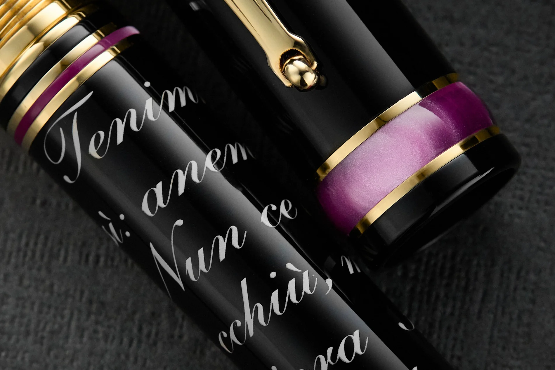 The special edition Delta Anema e Core fountain pen is a Goulet Pens exclusive! It's made of special resin hand-turned from a solid bar and mirror polished and comes with a 24kt gold-plated steel nib in a range of nib sizes. Special details like the music note-filled ring on the barrel and the pink accents contribute to its uniqueness.