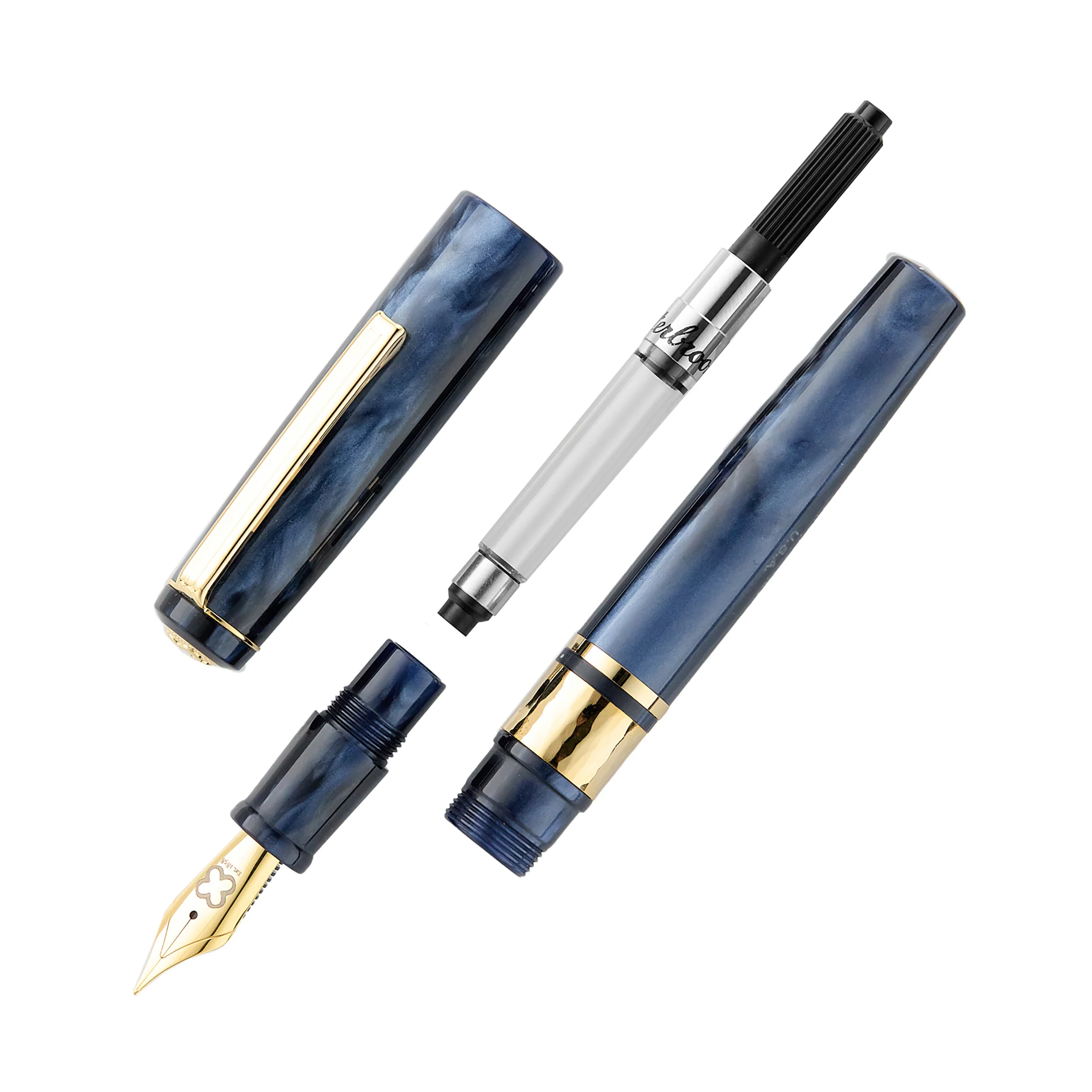 This blue fountain pen is the Esterbrook Model J in Capri Blue. It comes with gold-plated trim and a gold-plated JoWo #6 stainless steel nib. A modern take on a vintage classic. It fills via standard international cartridge/converter (included).
