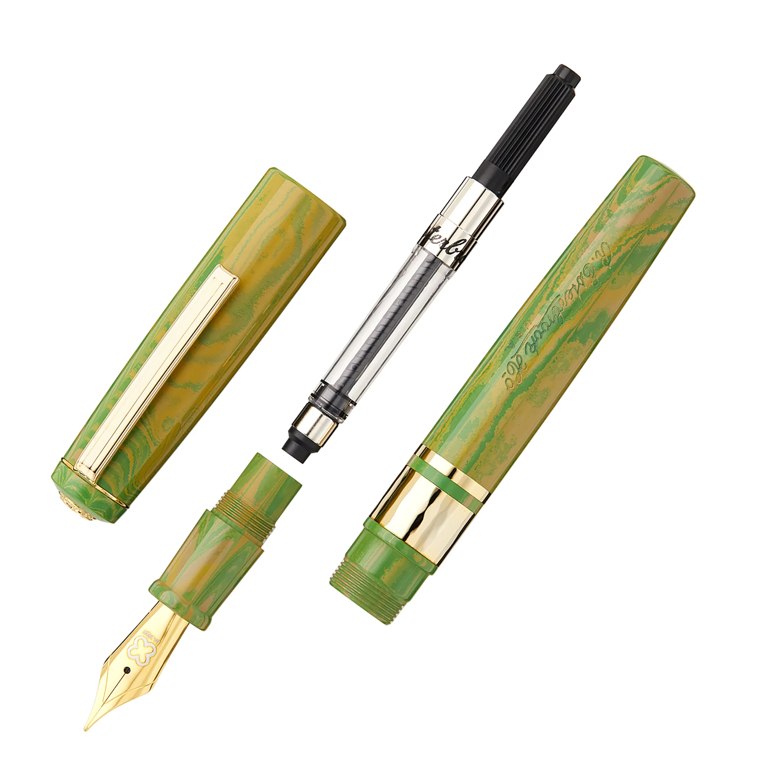 This green and yellow ebonite fountain pen is the Esterbrook Model J. It comes with gold-plated trim and a gold-plated JoWo #6 stainless steel nib. A modern take on a vintage classic. It fills via standard international cartridge/converter (included). In addition to the normal nib sizes, this pen is also available with select specialty nib grinds including the Journaler, Scribe, and Needle Point.