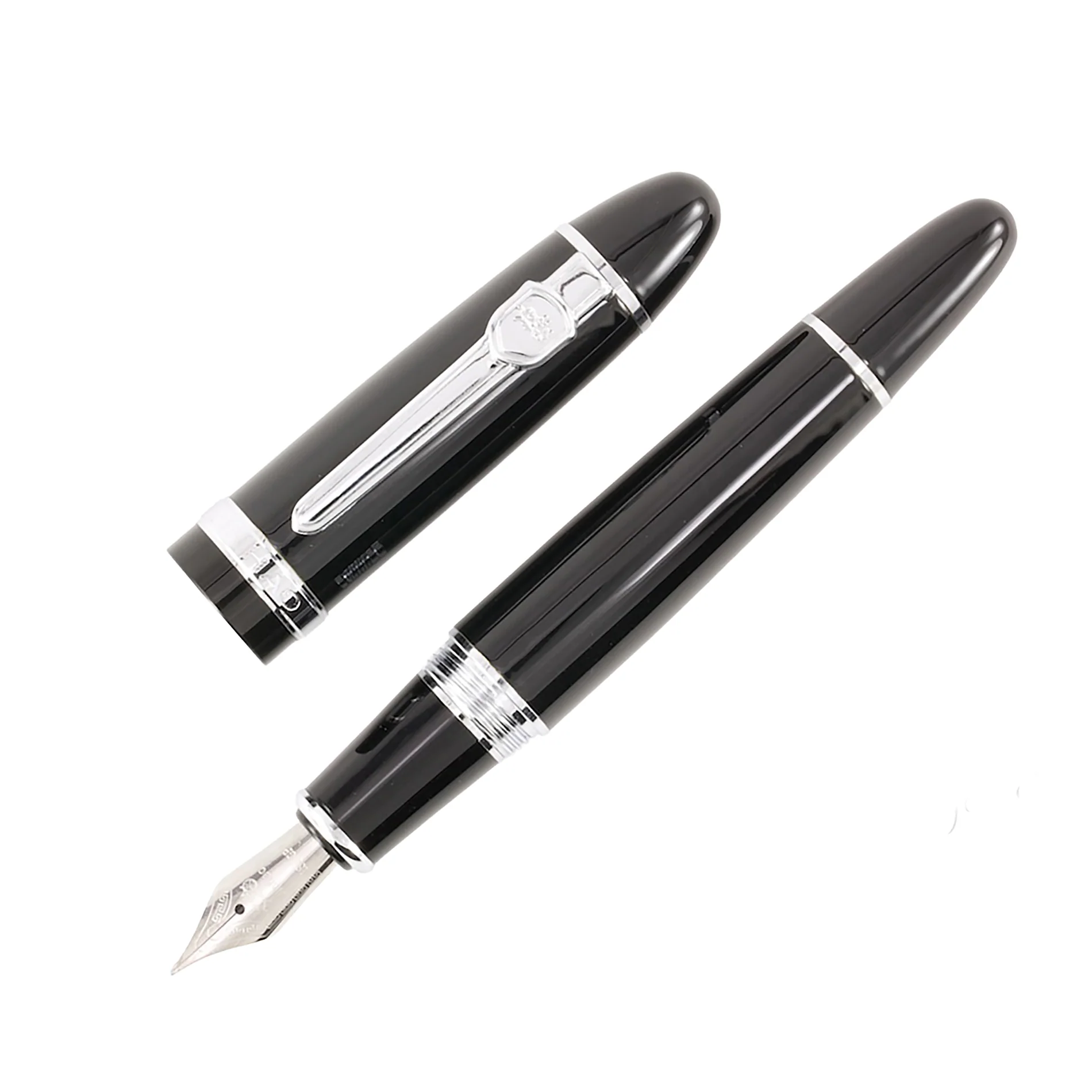 The Jinhao 159 fountain pen is made in China. It features a large, shiny black body, chrome hardware, and a #6 steel nib. It comes with a converter, and also accepts standard international ink cartridges (not included).