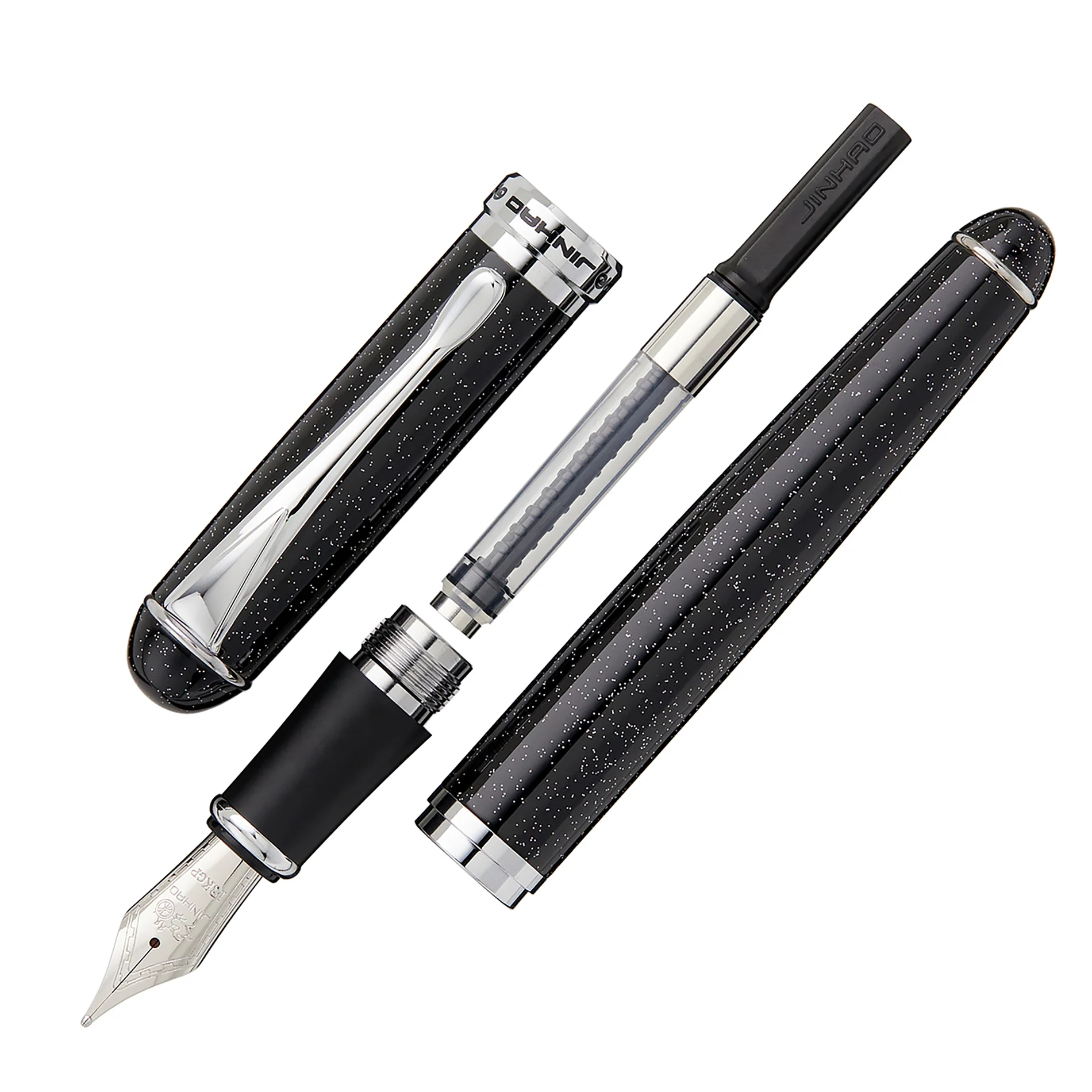 The Jinhao X750 fountain pen is made in China. It features a black body with tons of multi-colored sparkles throughout, chrome hardware, and a silver #6 steel nib. It comes with a converter, and also accepts standard international cartridges (not included).