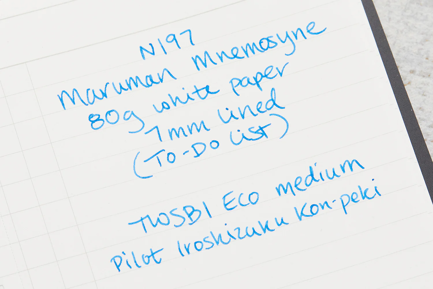 Made in Japan, this A6-sized notebook features 80 sheets of white acid-free 80gsm lined paper. The black double wire side spiral binding matches the black plastic cover. The notebook is structured like a daily to-do list – at the top is a blank margin for the date, followed by 7mm lined rulings with a spot for a checkbox on the left. The back side of each sheet is blank, and every page is micro-perforated.