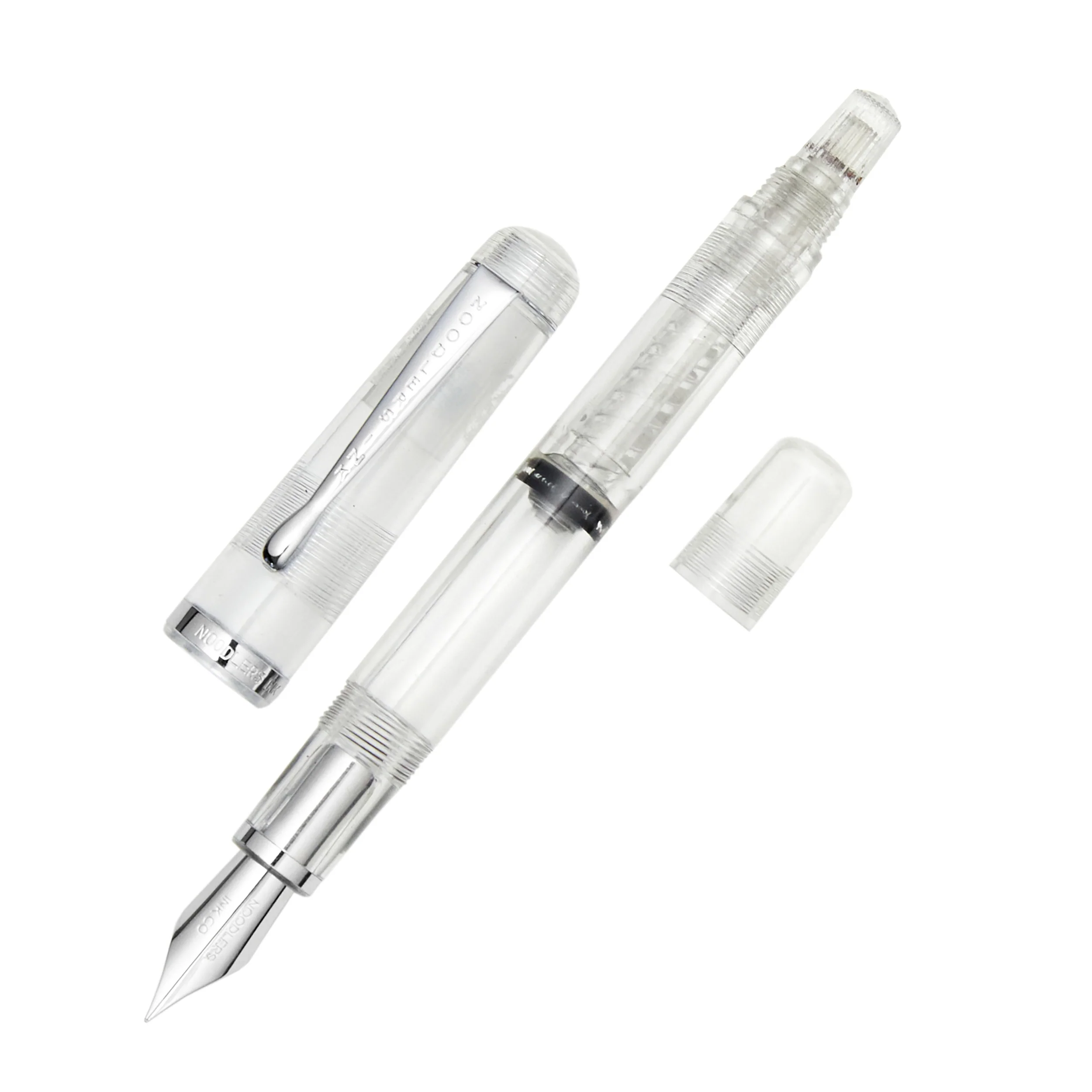 The Noodler's Konrad flex pen is smaller than the Ahab, but larger than the Nib Creaper. This clear fountain pen features a steel flexible nib and a twist piston mechanism with a blind cap. The Konrad is made of a celluloid derivative and is technically biodegradable and formed from a "renewable resource". The vegetal resin body of this pen may show particles or striations within the material. This is most noticeable in demonstrators and bright colors.