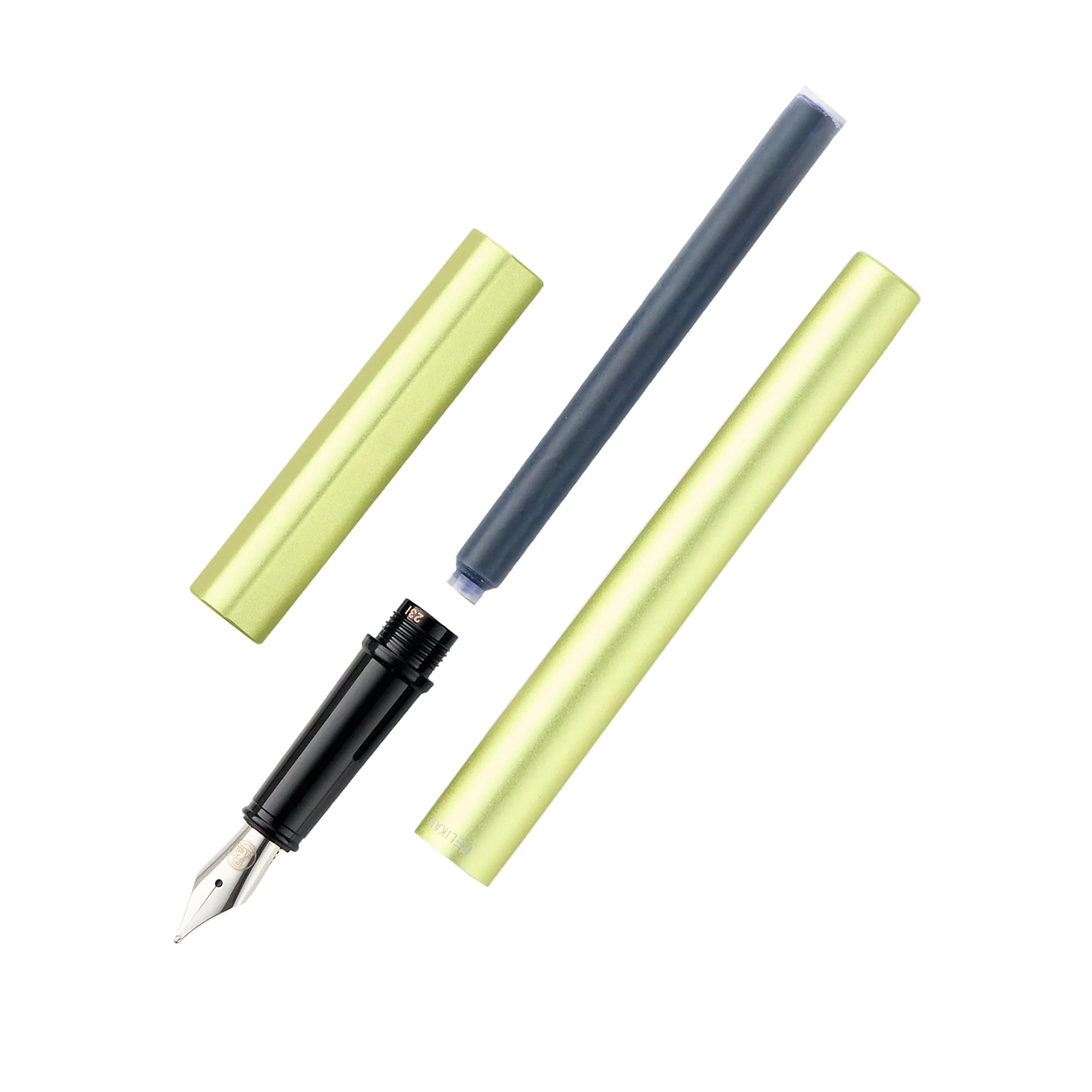 Designed with minimalism in mind, this clipless Pelikan Ineo fountain pen features a streamlined olive/lime green matte anodized aluminum barrel and cap. The drop-shaped cap helps prevent the pen from rolling away. The pen comes complete with a smooth writing silver stainless steel nib in medium.