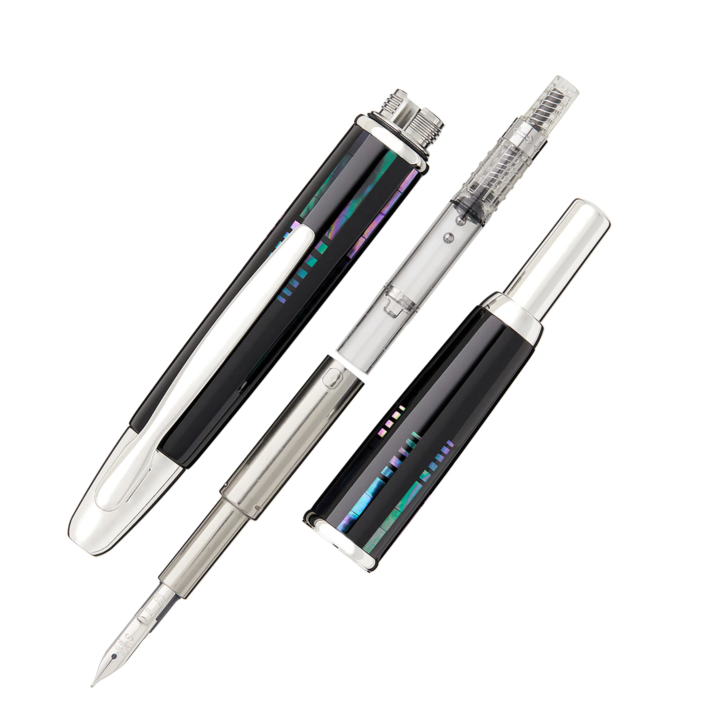 The Raden Vanishing Point is a spectacular example of Japanese Maki-e artistry, displaying the beauty of multi-colored abalone shells in a rich, hand lacquered urushi finish. Each piece of abalone shell is hand-cut and hand-laid into the pen. This fountain pen comes with a retractable rhodium-plated 18k gold nib - just click to expose or retract the nib. A hidden trap door helps keep the nib from drying out when not in use. A Pilot CON-40 converter is included with this pen, as well as a Pilot ink cartridge. A metal cartridge cap is also included for use with the ink cartridge. Each Vanishing Point fountain pen is beautifully merchandised in a black gift box.